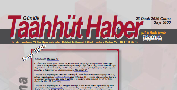 – “HİDROMEK, tarıma uygun çözümleri ve yeni Teleskobik Yükleyicisiyle AGROEXPO’da” BKZ Sayfa 9 22 Ocak 2026 Perşembe günü Taahhüt Haber’de yer alan Eşik Değer Üstü (EDÜ) (13a ilan) ve EDYÜ (Eşik Değerin Yarısı Üstü ancak Eşik Değerin Altında) yapım ihale duyuruları, SBİS (Sözleşmeye Bağlanmış ihale Sonuçları) ve İhalelere verilen tekliflerin özetleri için BKZ Sayfa 9-17