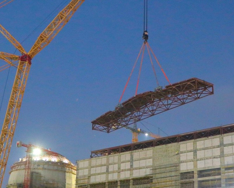 Her biri 110 ila 200 ton ağırlığında olan kirişler, parçalar şantiyede bu işlem için önceden hazırlanan iki kızak üzerinde paralel olarak birleştirilerek monte edildi. Montaj işlemi sırasında Liebherr 13000 ağır paletli vinç kullanıldı. İnşaat ekibi, yapının son kirişlerini monte etmeden önce, hava giderici ve besleme suyu depolama tankı da dahil olmak üzere birkaç parça ağır ve büyük türbin ekipmanının kurulumunu gerçekleştirdi. Bir sonraki aşamada ise çatı kaplamasının montajı yapılacak.