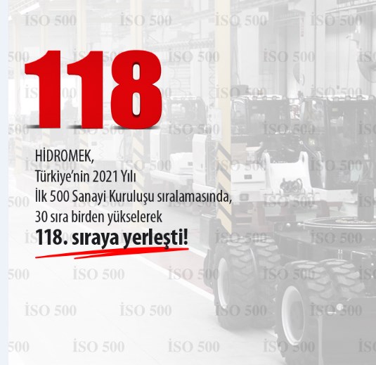 Dünyanın en büyük 50 iş makinesi üreticisinden biri olan HİDROMEK, Türkiye’nin ve Ege Bölgesi’nin en büyük sanayi kuruluşları listelerinde yükselmeye devam ediyor. İstanbul Sanayi Odası tarafından açıklanan ‘Türkiye’nin 500 Büyük Sanayi Kuruluşu’ (İSO 500) 2021 araştırması, şirketlerin bir önceki yıla ait üretimden satışlar verilerine dayanarak hazırlanıyor. Firmalar aynı zamanda, brüt katma değer, öz kaynak ve ihracat gibi kriterlere göre de sıralanıyor.