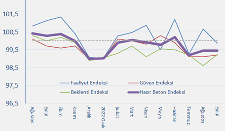 Türkiye Hazır Beton Birliği (THBB) inşaat ve bununla bağlantılı imalat ve hizmet sektörlerindeki mevcut durum ile beklenen gelişmeleri gösteren “Hazır Beton Endeksi” 2022 Eylül Ayı Raporu’nu açıkladı. Faaliyet Endeksi, ağustosta yukarı yönlü bir hareketin sonrasında eylülde yeniden eşik değerin altına gerileyerek istikrarsız bir hareket gösterirken Birleşik Beton Endeksi, beklentideki yükselişe rağmen faaliyetteki azalmanın etkisi ile geçen ay ile aynı düzeyde kaldı.