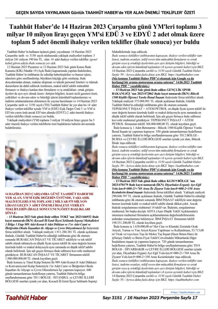 İhale Sonuçlarının (İhalelere verilen tekliflerin) tam listesi için BKZ 14 Haziran 2023 Çarşamba tarihli ve 3150 sayılı Günlük Taahhüt Haber Sayfa 55-60