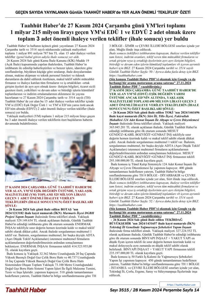 26 Kasım 2024 Salı günü Kamu İhale Kanunu (KİK) Madde 19 (Açık İhale) kapsamında yapılan ihalelerden, Taahhüt Haber’in istihbaratı ile edinilip haberleştirilen ve benzer işlere, idarelere göre sınıflandırılıp, büyükten küçüğe göre sıralanıp, ihale dosyalarından alınan, makine ekipman ve teknik personel listeleri ve ödenek durumların da dahil edilerek özetlenen, makul teklif sahibi müteahhit firmanın ve ihaleye katılan tüm firmaların ve iş ortaklıkları -ortak girişim üyeleri de ayrı ayrı olmak üzere- iletişim bilgileri, ticaret sicili gazetesi özeti, yetkilileri ve devam eden ve bitirdiği işlerin kümülatif toplamlarının ve indirim ortalamalarının eklenmesi ile yayına hazırlanan ve 27 Kasım 2024 Çarşamba tarih ve 3514 sayılı (TH) Taahhüt Haber’de yer alan bu 15 adet ihaleye verilen teklifler içinde YM’si (EDÜ) Eşik Değer Üstü 1 ve YM’si ED’nin yarısı üstü ancak ED’nim altında (EDYÜ) 2 adet önemli ihaleye verilen teklifler (ihale sonucu) yer buldu.