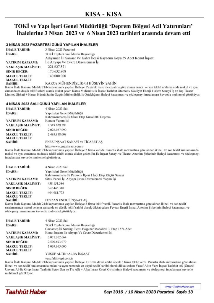 TOKİ ve Yapı İşeri Genel Müdürlüğü ‘Deprem Bölgesi Acil Yatırımları’ İhalelerine 3 Nisan 2023 ve 6 Nisan 2023 tarihleri arasında devam etti